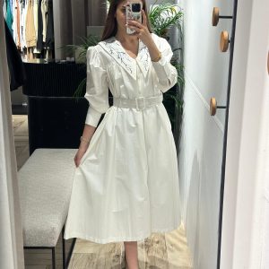 فستان أبيض مطرز بخيوط لون كحلي